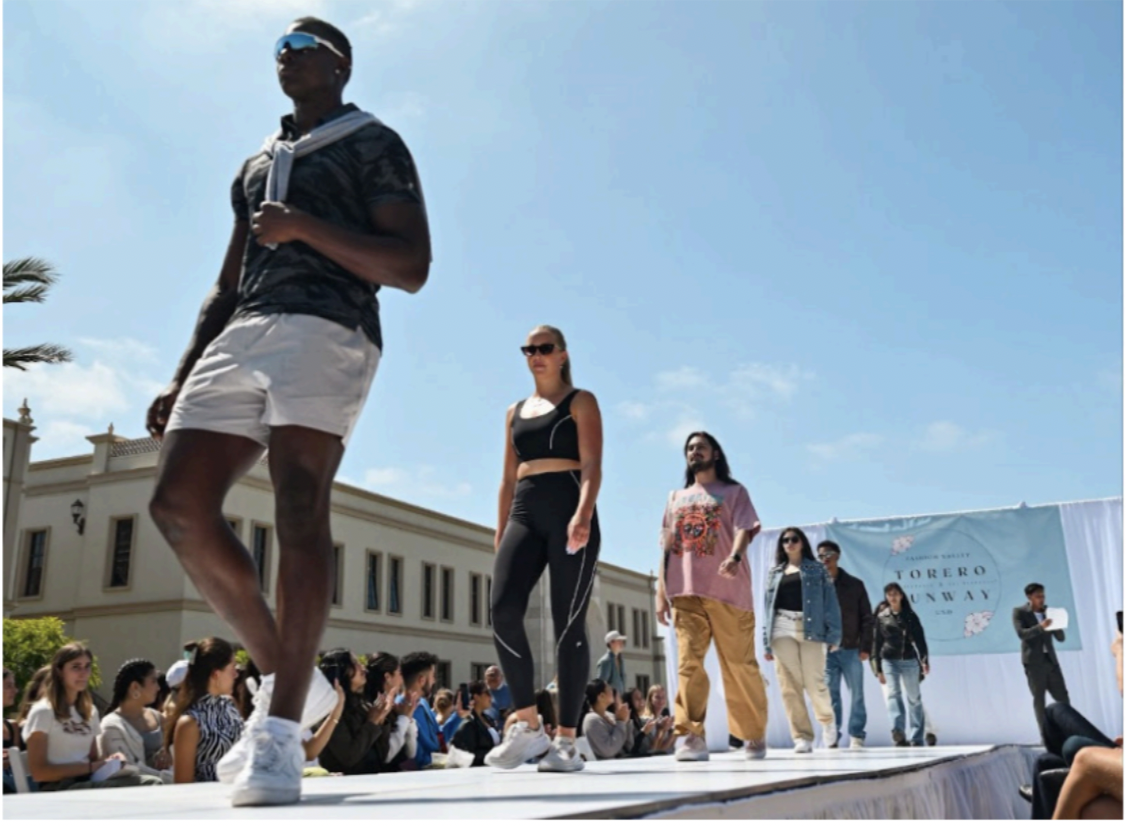 As morning clouds finally parted last Thursday, the Paseo de Colachis was primed for the Torero Runway: a fashion show benefiting survivors of recent wildfires and the Maui Strong Fund. Seventeen students graced the catwalk in outfits from Fabletics, Forever 21, Express, Madewell, Allsaints, Vuori, American Eagle and Zara, all provided by the event’s sponsor: Fashion Valley Mall.