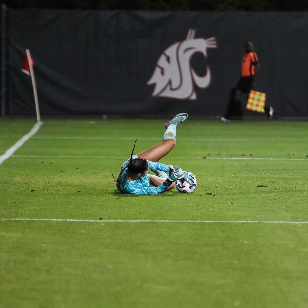 USD womens soccer goalie, llise Medrano, saves a shot kicked by Washington State. Photo courtesy of @usdwsoccer/Instagram