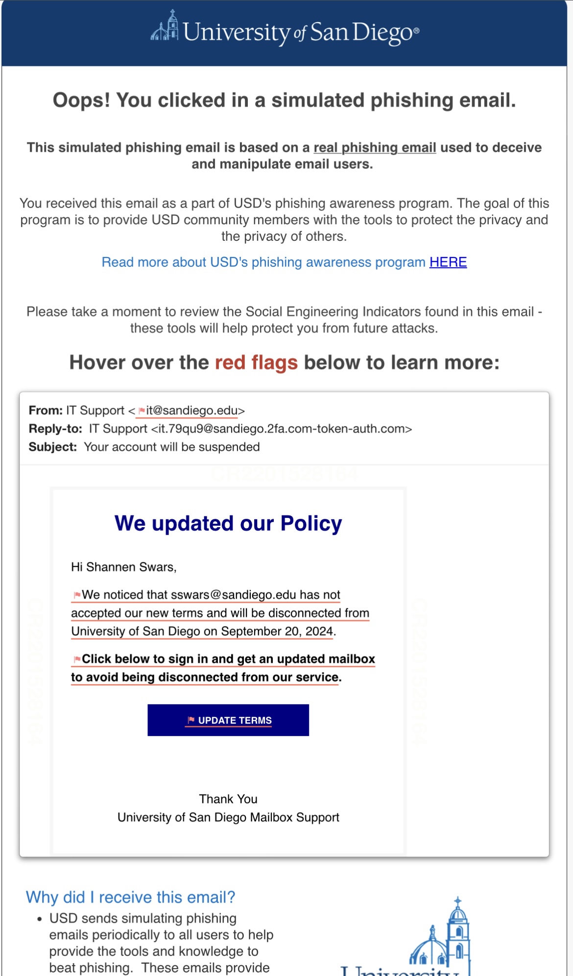 “Yeah, I’ve seen them because I got it once before,” Hernandez said. “I got an email and I just I was like, what is this? Because I kind of thought it was like I was in trouble. So I just clicked on the link and it’s like, ‘you’ve been phished.’ If you see a link like this, don’t click it because this is what happens if you do, people steal your information and things. And itt looked official, like it looked like it would be from somebody from USD. I mean, like they gave a picture in an example and everything.”