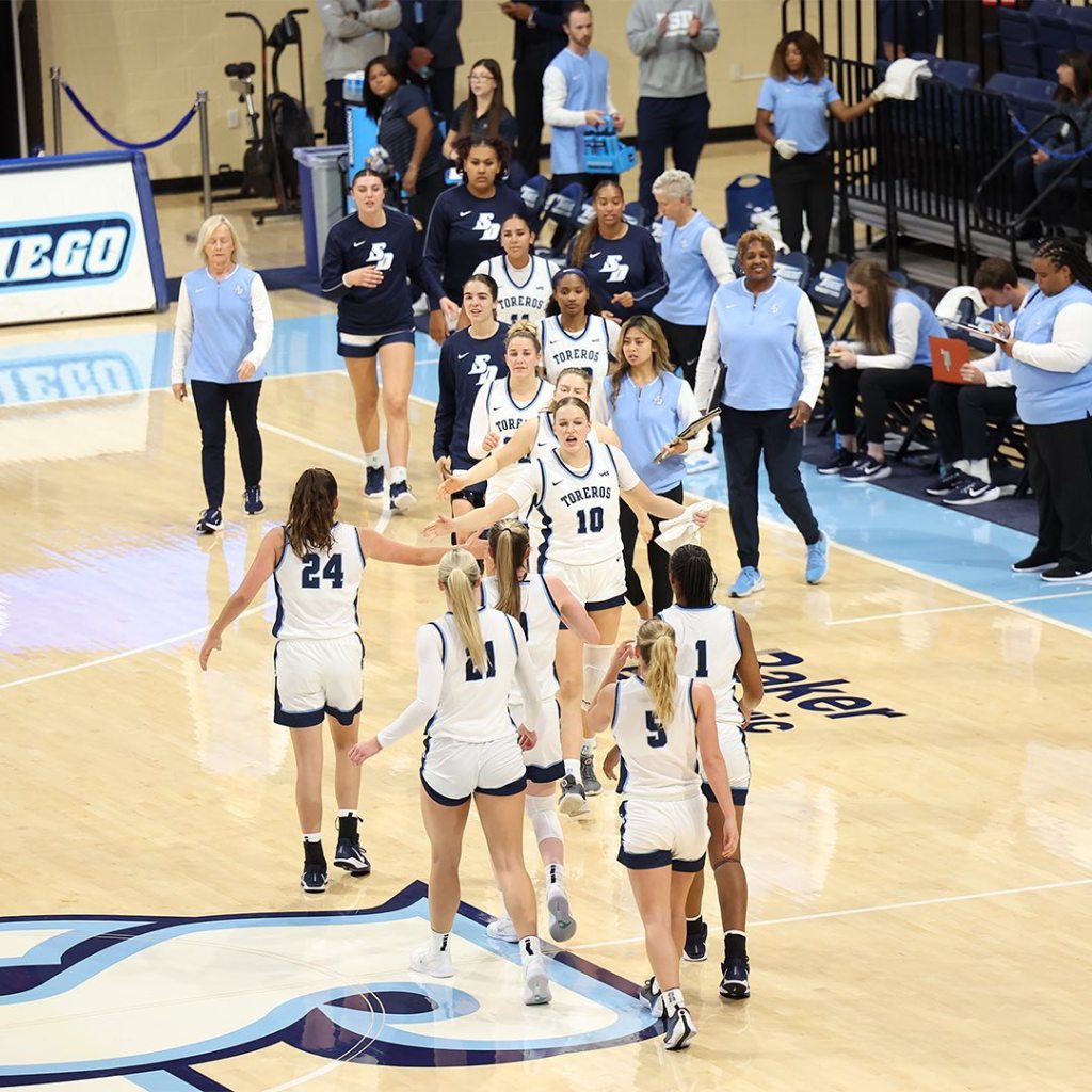USD women’s basketball pictured celebrating each other after beating Biola University 75-30. Photo courtesy of @usdwbb/Instagram