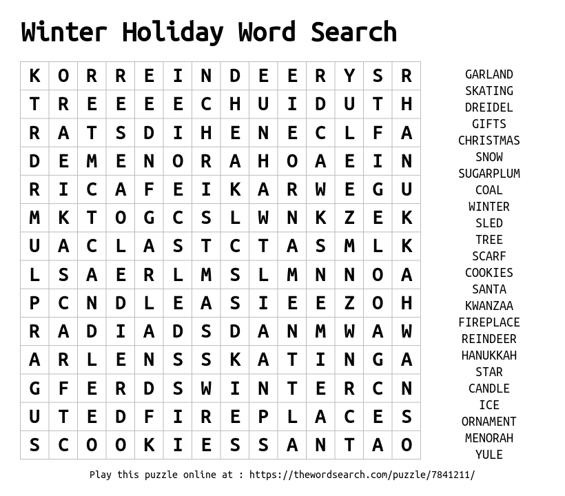 Word bank: Garland, Skating, Dreidel, Gifts, Christmas, Snow, Sugarplum, Coal, Winter, Sled, Tree, Scarf, Cookies, Santa, Kwanzaa, Fireplace, Reindeer, Hanukkah, Star, Candle, Ice, Ornament, Menorah, Yule
