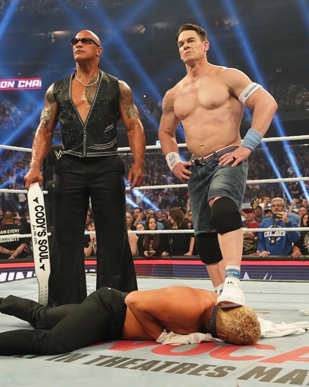 Dwayne “The Rock” Johnson (left) and John Cena (right) stepping on Cody Rhodes. Photo courtesy of @johncena77c/Instagram