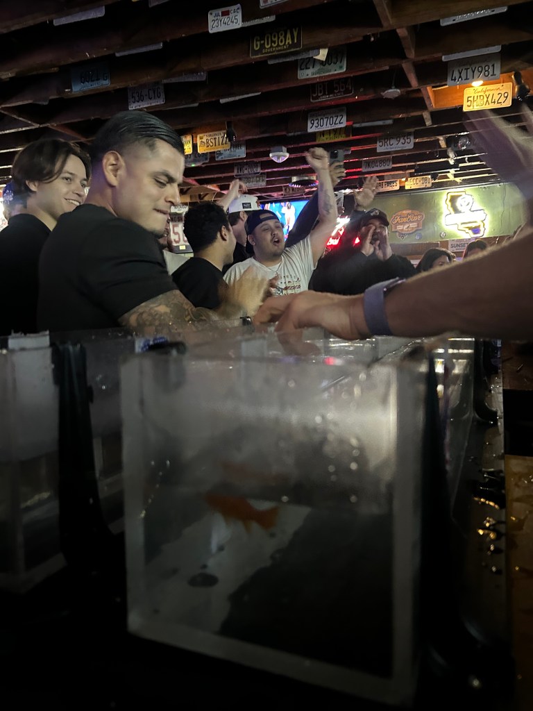 The infamous goldfish races have taken place weekly since the establishment of the PB Shore Club in 2007. Every Wednesday, people gather in lines which wrap around the street as a result of the race, signaling the competition’s immense success throughout the years. Employees enthusiastically work their rounds through the bracket. Throughout the heats, one employee utilizes a megaphone and acts as the emcee for the crowds in the room. While the fish races are in full force, simultaneously there are TVs set up with other sports games outside, yet the crowds flock to the tanks on floor two of the venue. However, on the ground below, animal advocacy groups have began calling out the bar for their practices – protesting the races altogether with signs and chants.