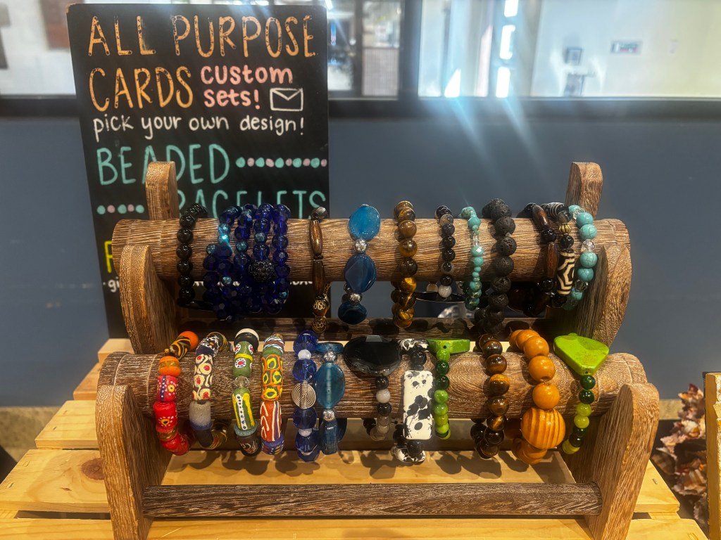 Joyce Porter’s beaded bracelets made from jade, tiger’s eye, and other stones — all for sale. Riley Rains/The USD Vista