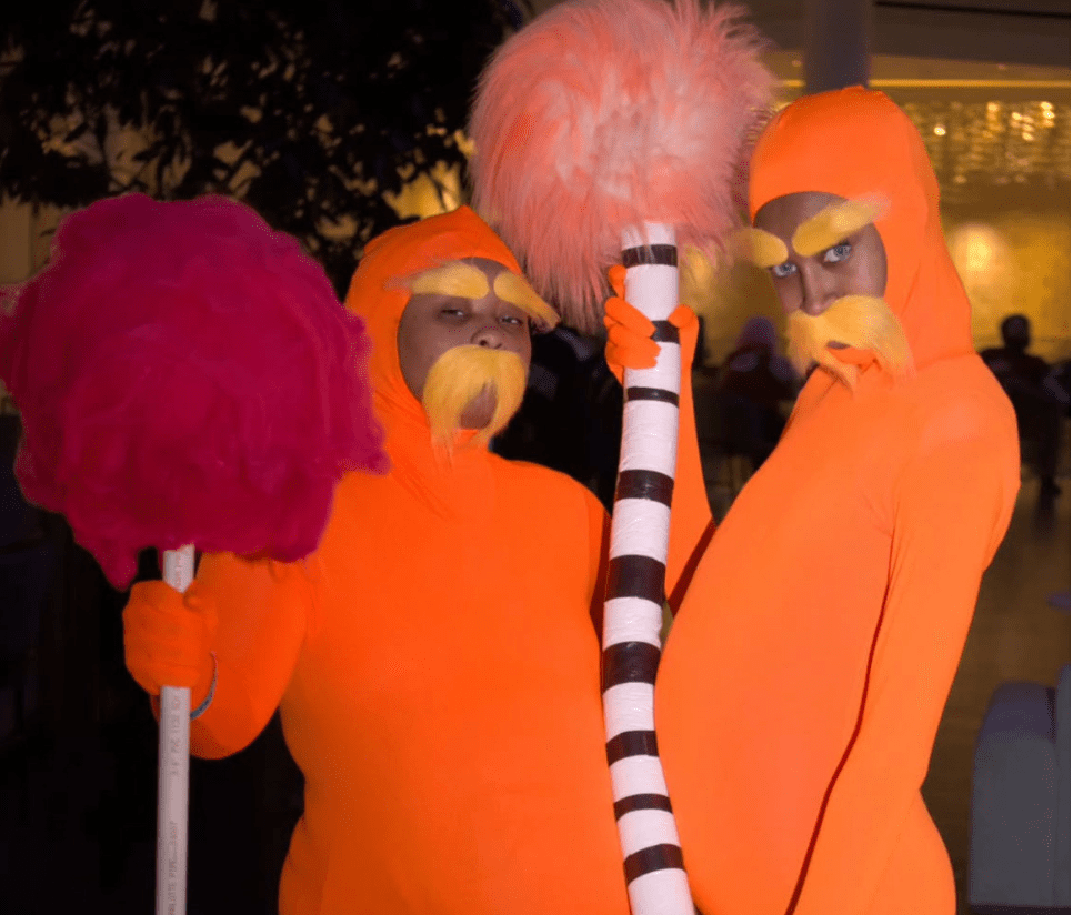 Two students humorously dress as the Lorax on Halloween, wearing matching outfits and holding Truffula trees. Photo courtesy of @twizsilver/Instagram