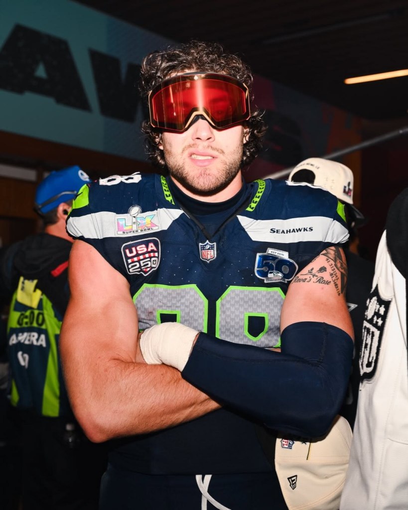 Seahawks tight end AJ Barner celebrates the win. Photo courtesy of @seahawks/Instagram