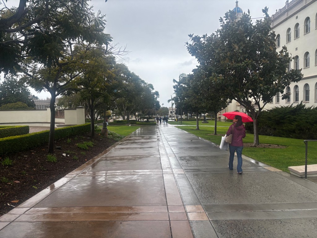 A Pacific storm showering down the West Coast hit USD on Feb. 16, showering students on their way to class. Hailey Howell/The USD Vista