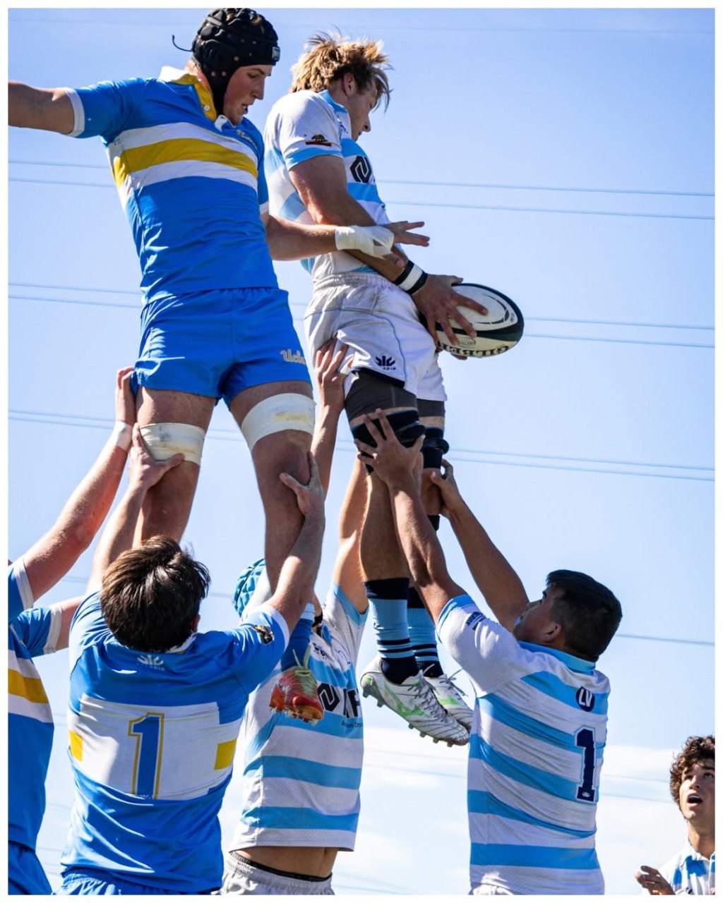 USD senior Sam Carlson receives the ball on a line-out (inbounding play). Photo courtesy of @usdrugby/Instagram