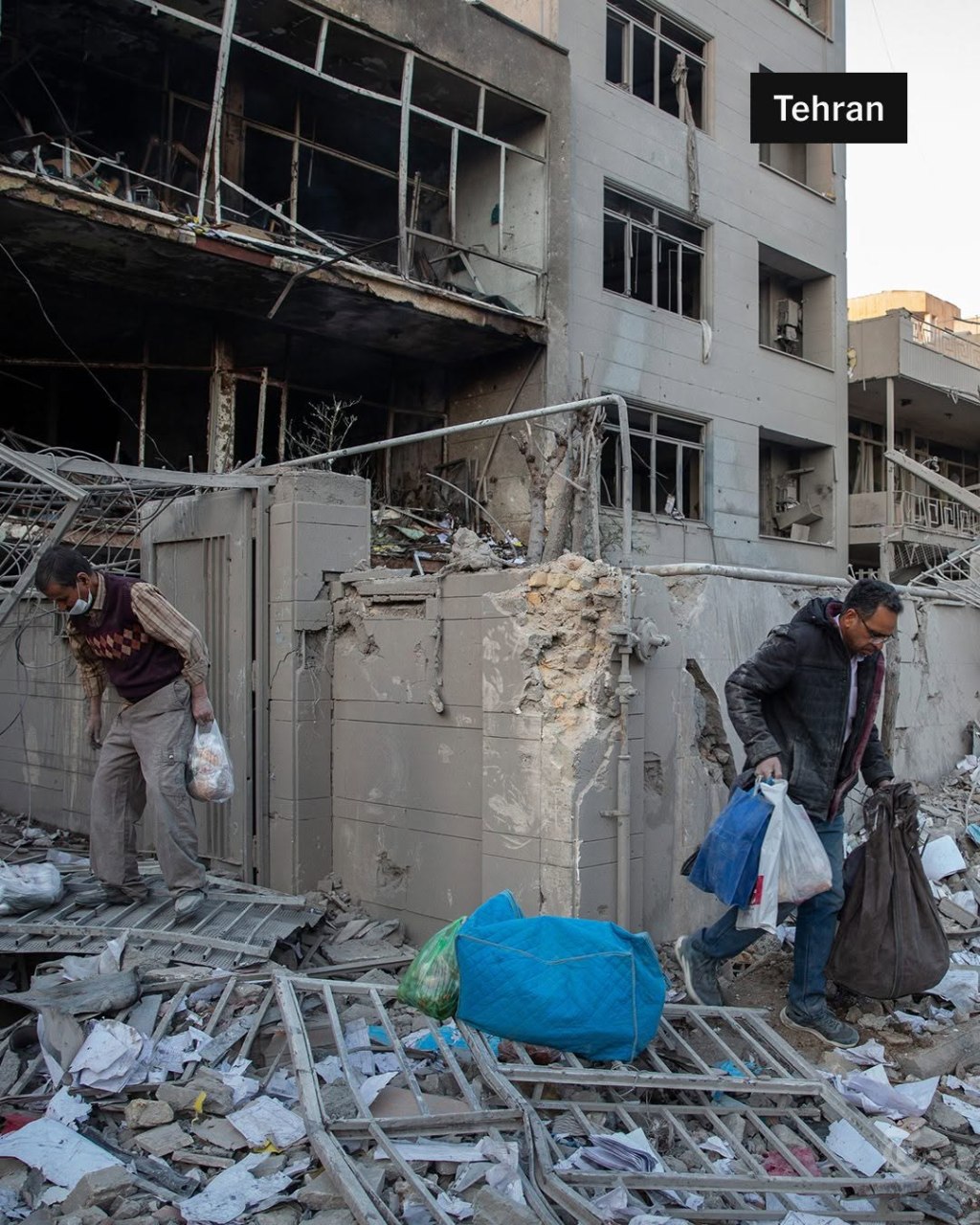People sift through remnants in Tehran, Iran after a strike hit nearby buildings. Photo courtesy of @nytimes/Instagram