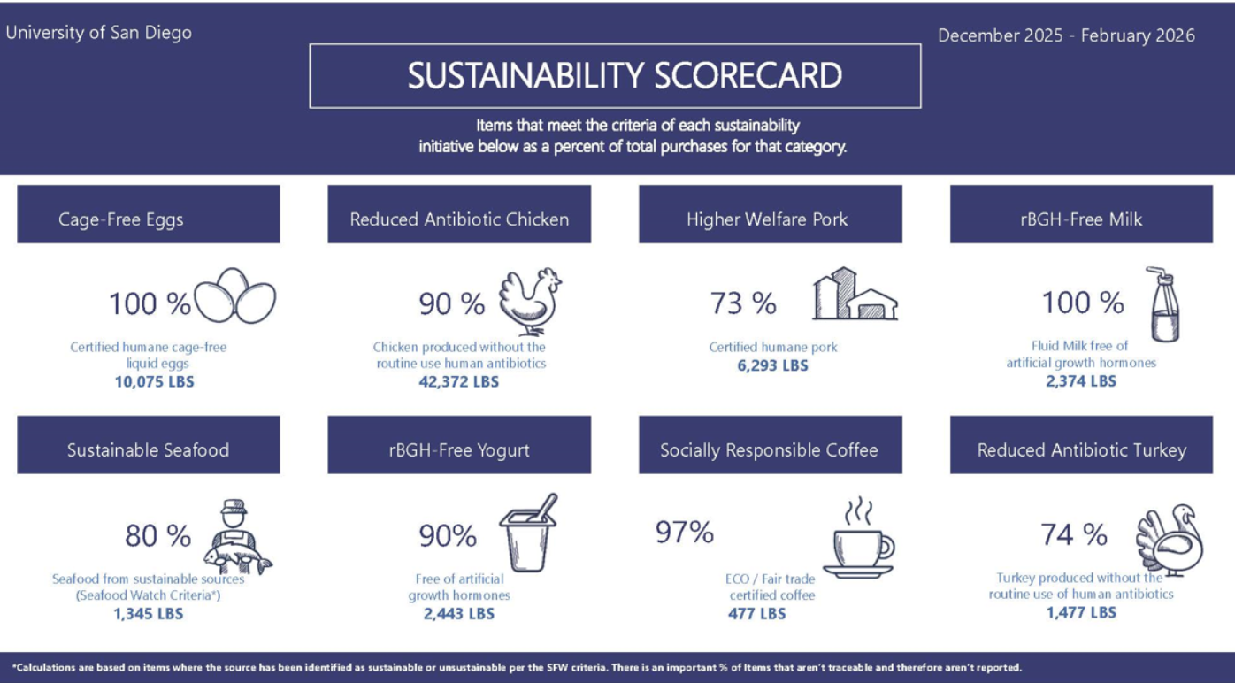 This scorecard was provided by Sysco, the food vendor for USD which measured from December 2025 to February 2026. The scorecard calculated the total purchases for each sustainability initiative. For that period, USD purchased all of their liquid free egg stock from cage free liquid eggs, 90% of their stock of reduced antibiotic chicken, 73% of their stock of higher welfare pork and 80% of their stock of sustainable seafood, among other items for on-campus dining.